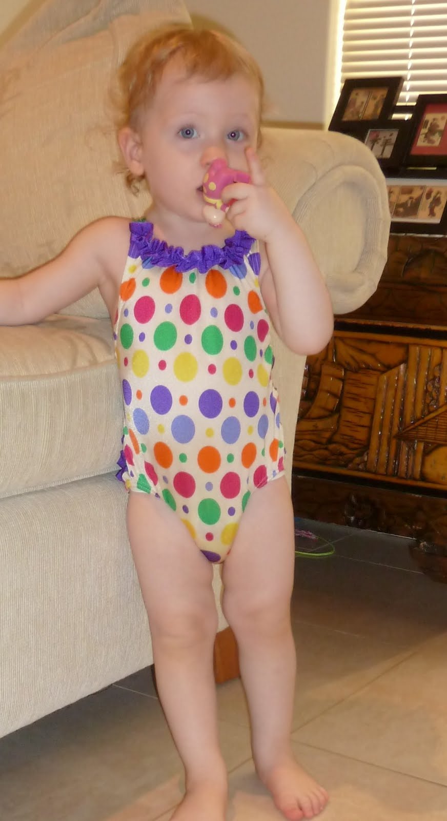 Here are some bathers I made for Talia to wear for her first swimming lesson. I thought the material was chlorine resistant, but they turned yellow within 10mins of being in a Hydrotherapy pool!!! which is a pitty, as I love this white & polka-dot fabric!